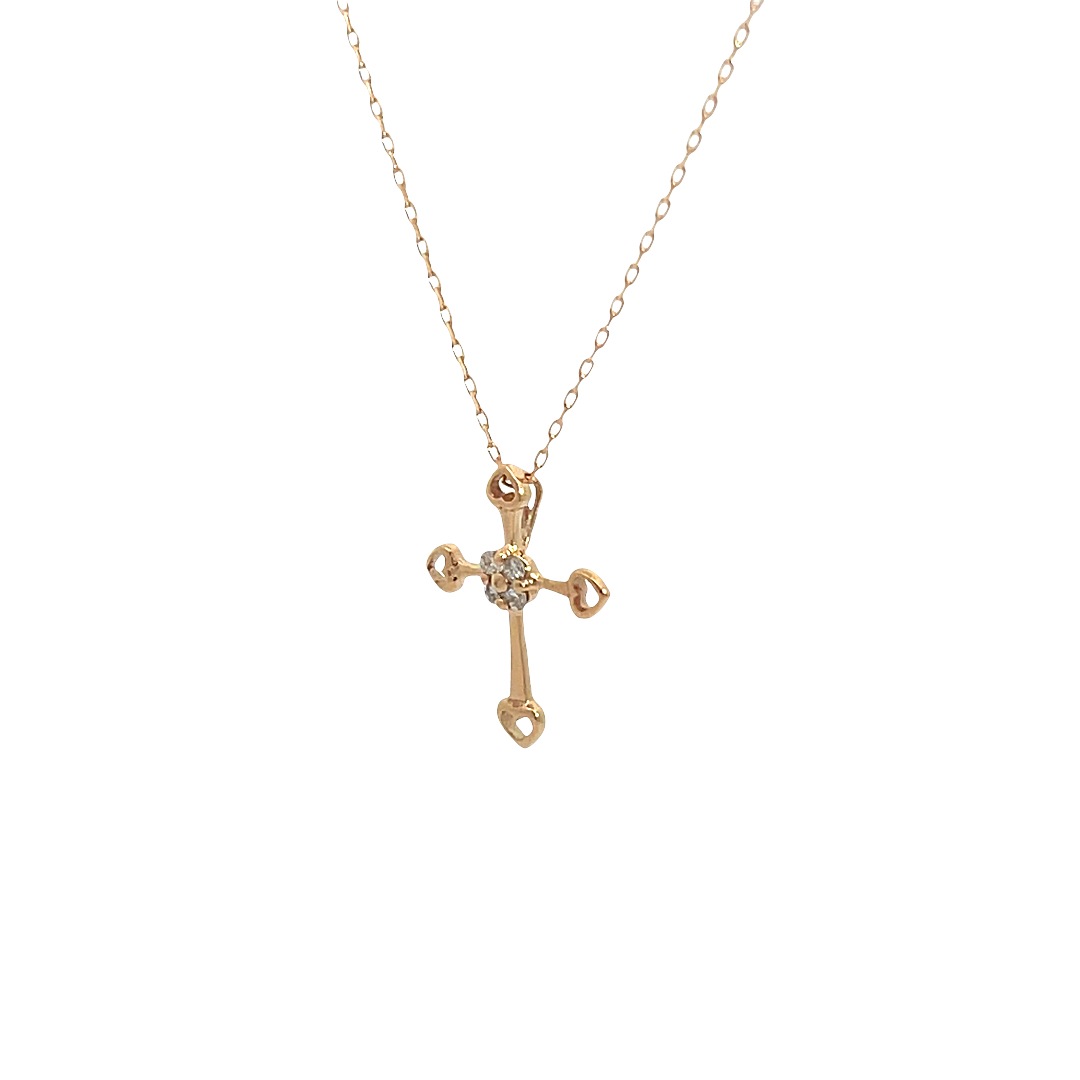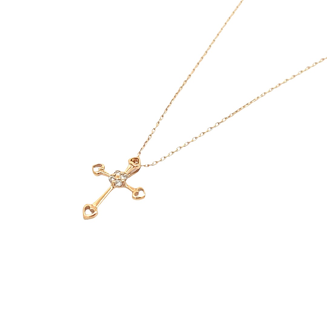 繊細な輝きを放つK10ゴールドのクロスモチーフネックレス。中央にはブリリアントカットのダイヤモンドがあしらわれ、胸元で上品に煌めきます。クロスの先端には可愛らしいハートのディテールが施されており、フェミニンな魅力をプラス。